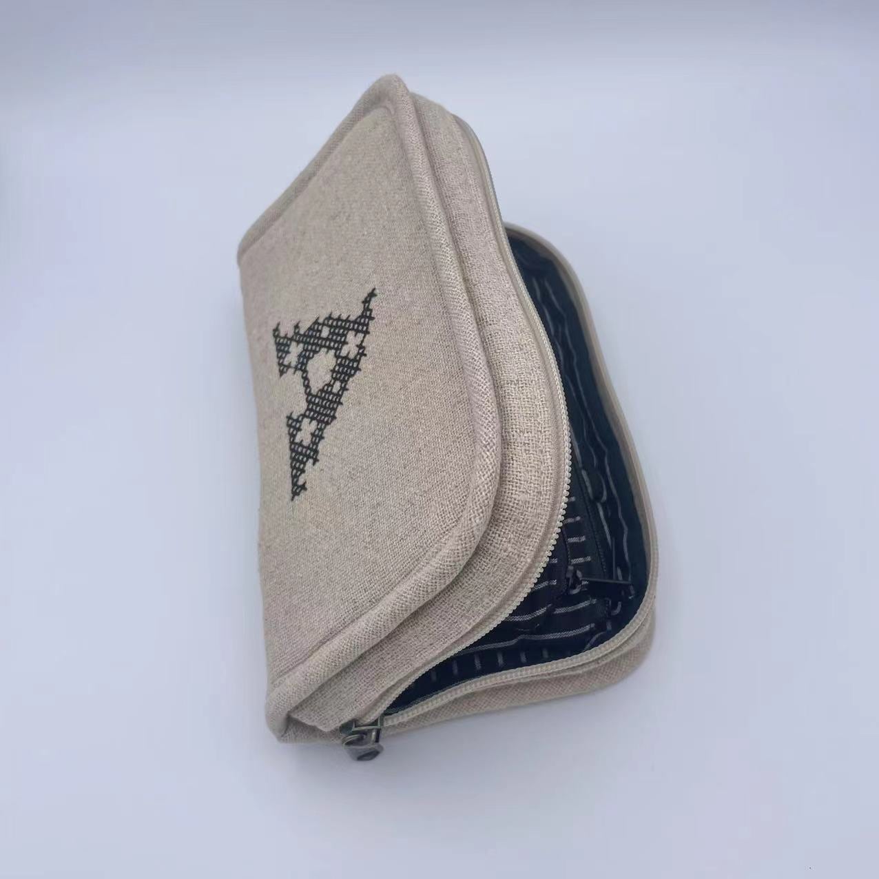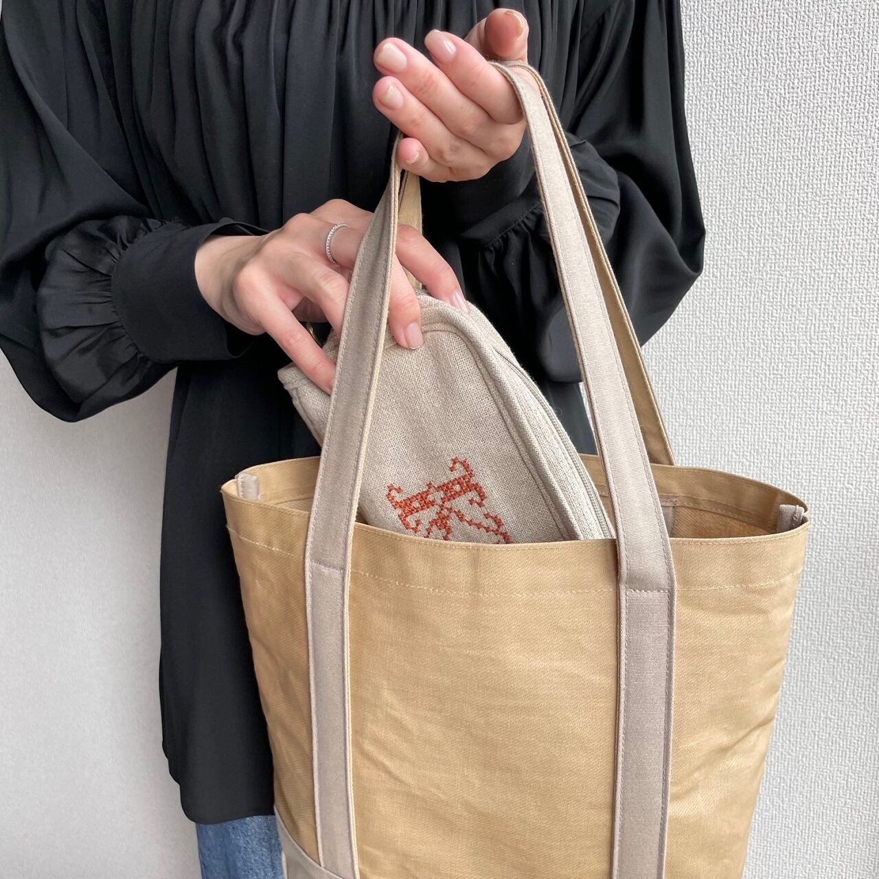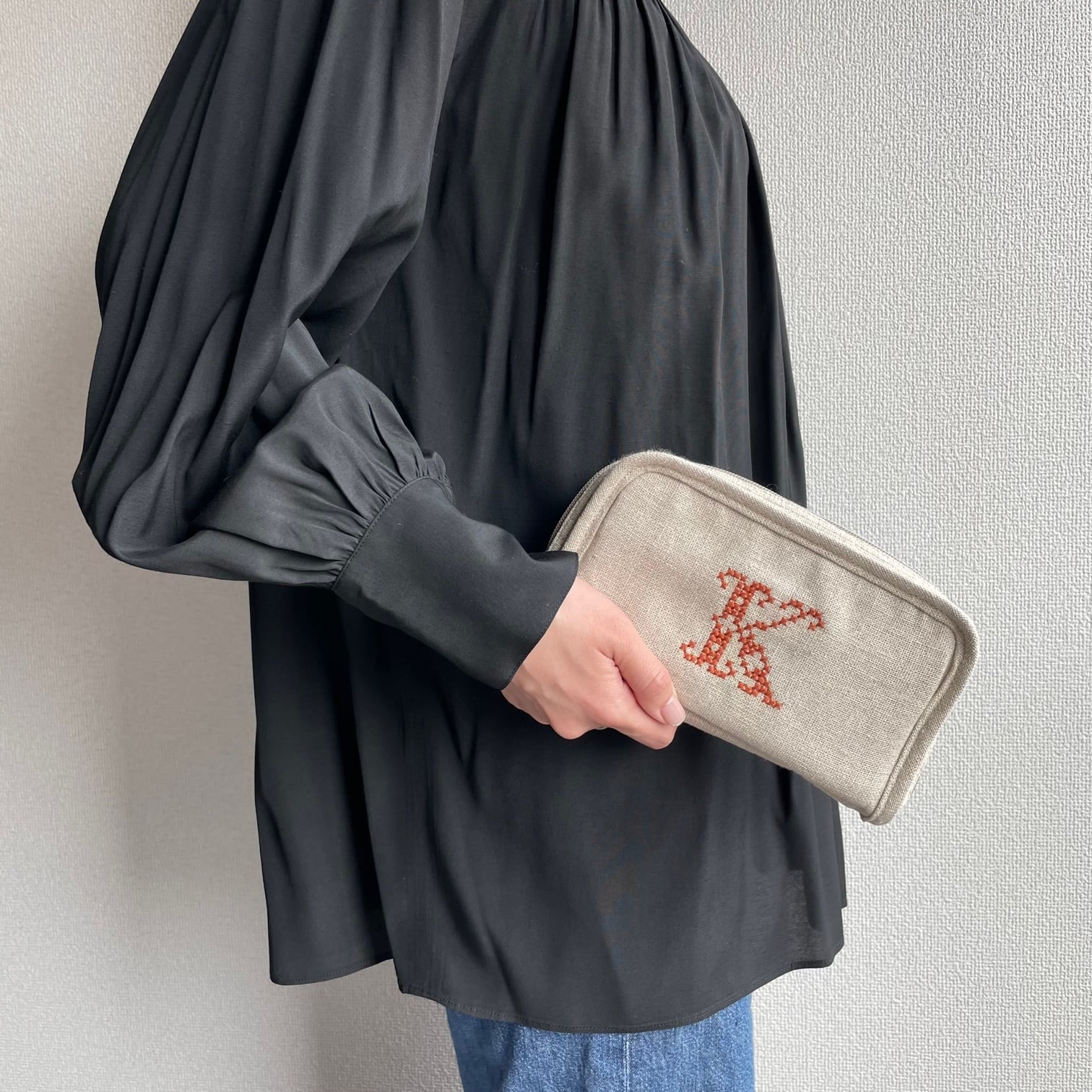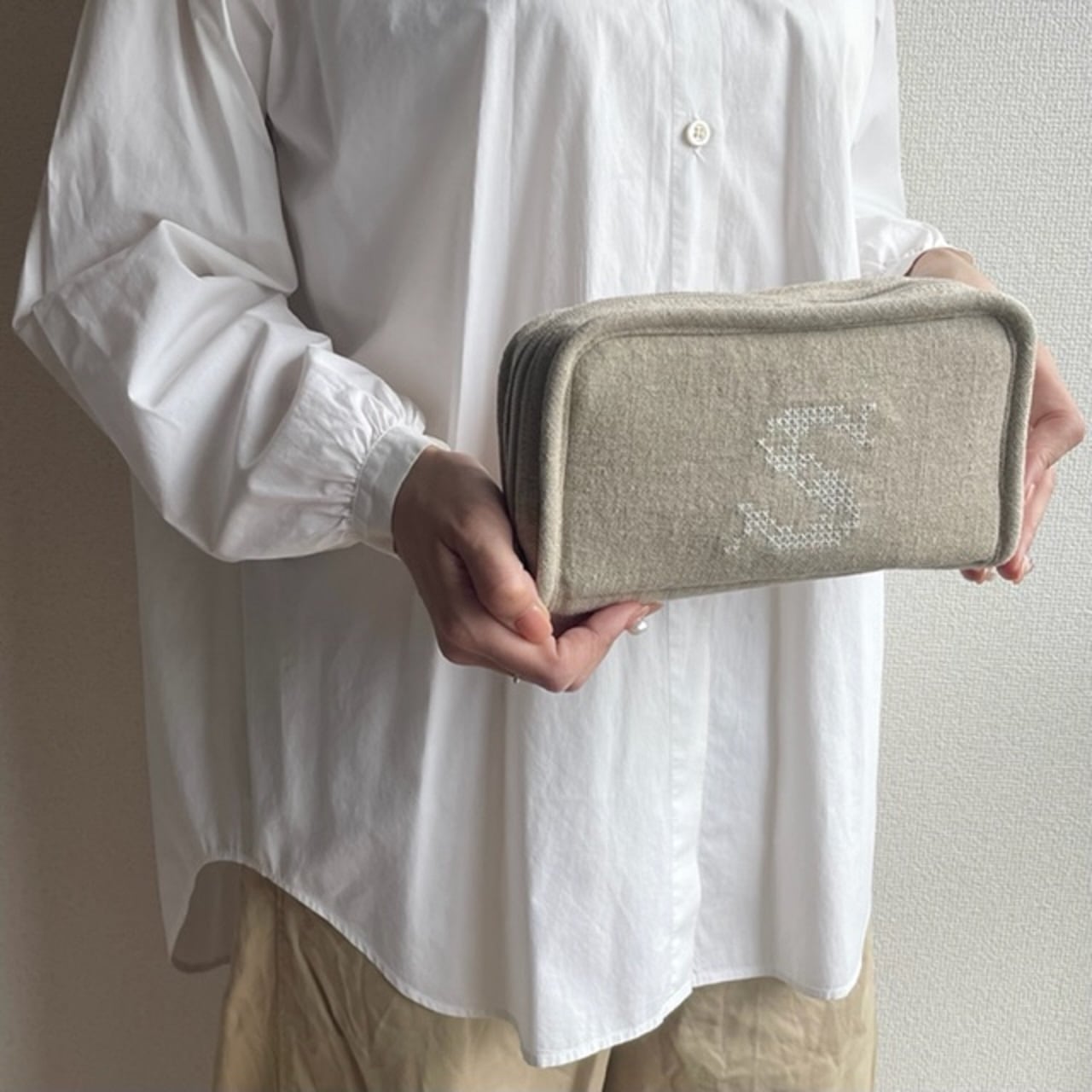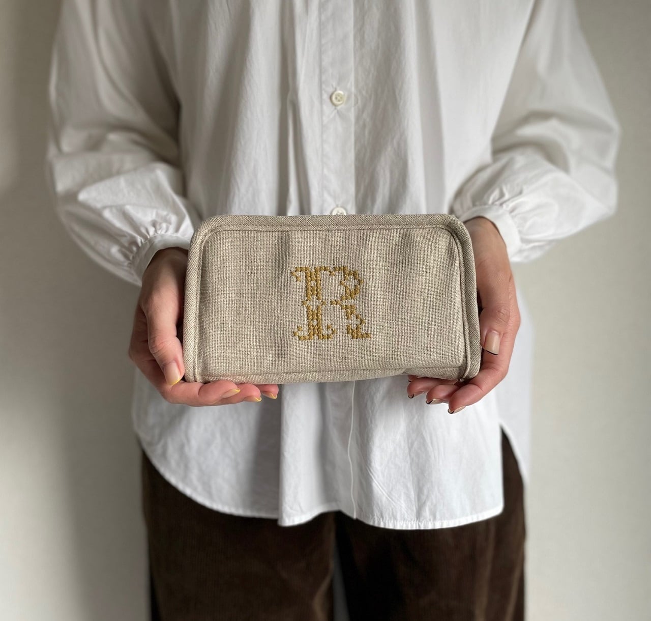 リネンの風合いが特徴的なオリジナル生地にクロスステッチ刺繍を施したデイリー使いにおすすめのポーチです。