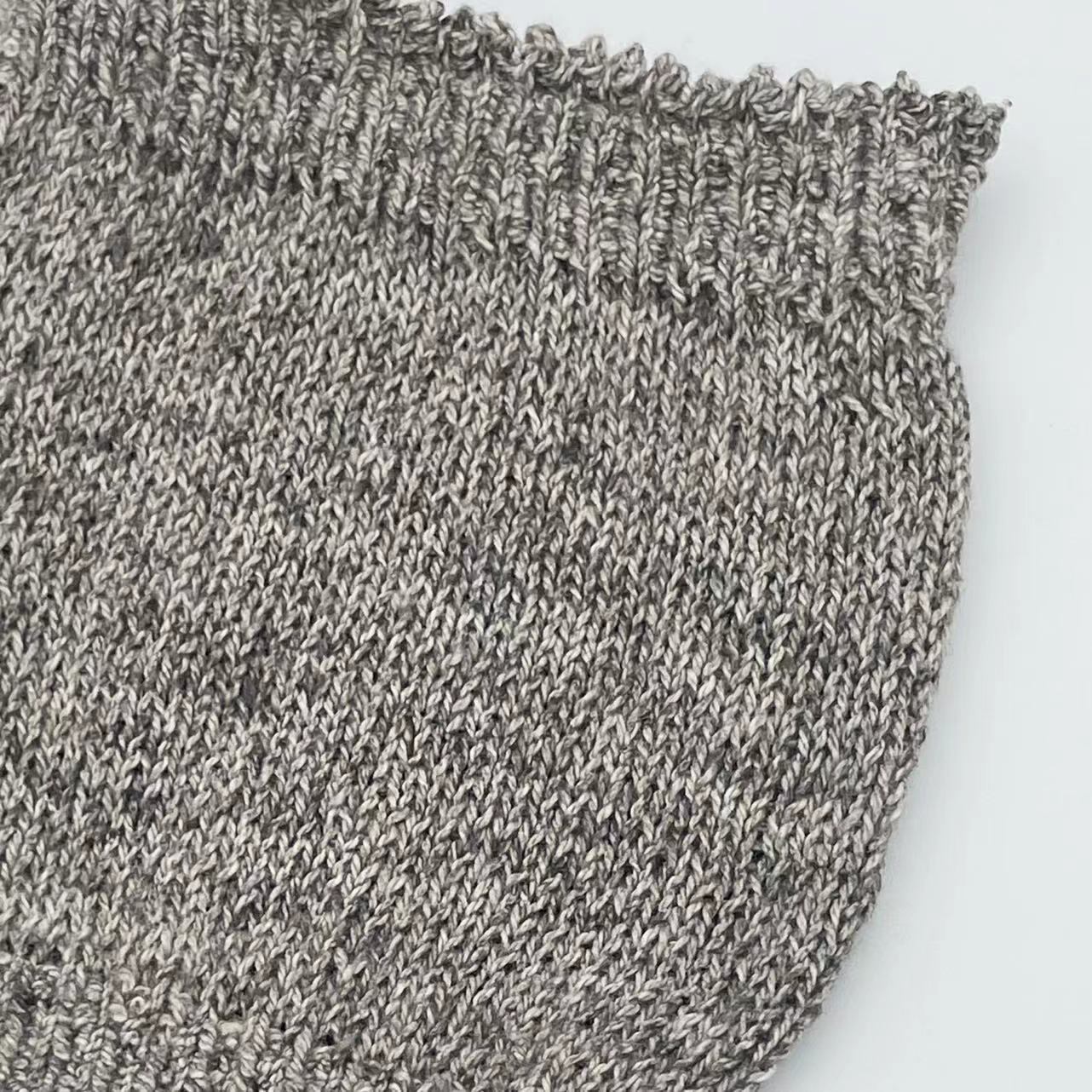 輪針で一点ずつ丁寧に編立てており、手編みならではの味わいのある仕上がりです。