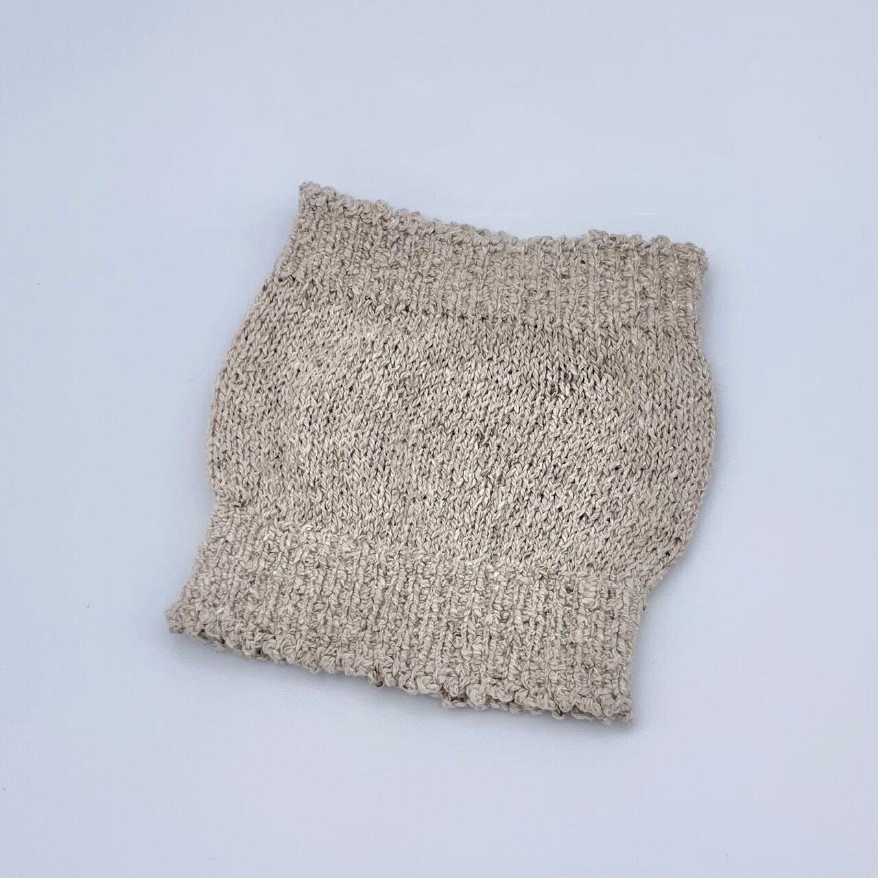 輪針で一点ずつ丁寧に編立てており、手編みならではの味わいのある仕上がりです。